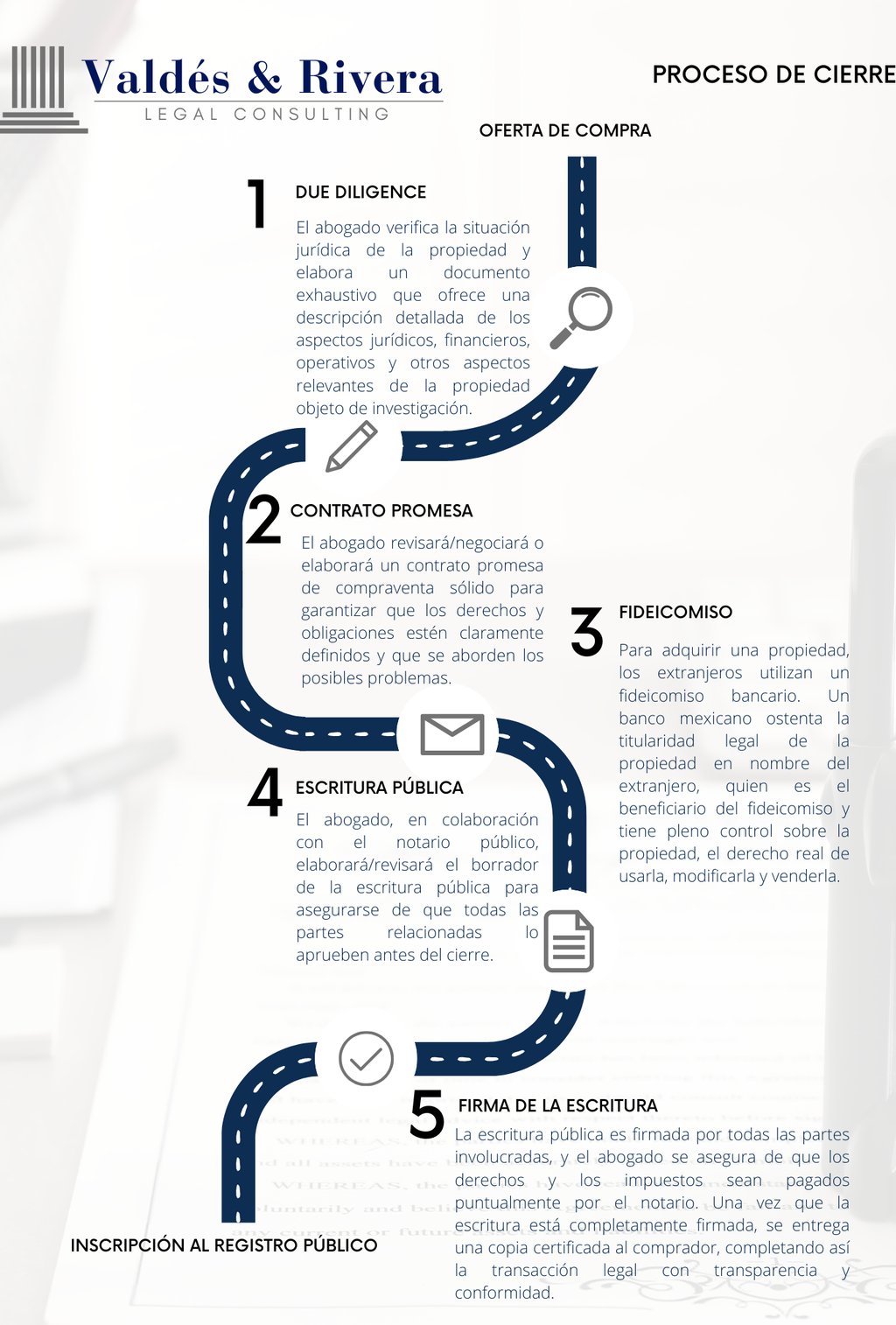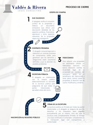 ¿Estás considerando comprar una propiedad en México como extranjero? El proceso puede parecer complejo, pero con la asesoría adecuada, es seguro y transparente. En este artículo, te guiamos paso a paso a través del proceso de cierre, desde la verificación legal inicial (Due Diligence) hasta la firma final de la escritura. Descubre cómo funciona el fideicomiso bancario, por qué es clave el Contrato Promesa y qué garantías ofrece la Escritura Pública. Conoce cómo expertos legales aseguran que tu inversión esté protegida en cada etapa. ¡Transforma el sueño de tener una propiedad en México en una realidad con información clara y confiable!